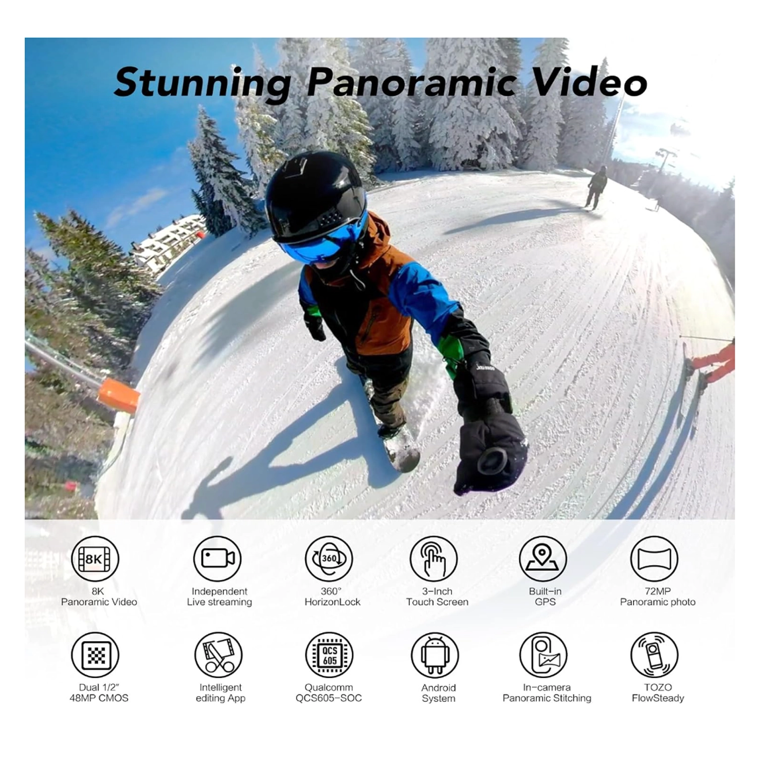 - [Professional Action Camera] The TOZO AnyVue is equipped with dual 1/2” 48MP CMOS sensors, enabling the capture of exquisite details and lifelike visual effects in stunning 5.7K Panoramic Video. Whether you are shooting action-packed scenes or still shots, this camera ensures impeccable preservation of every intricate detail.